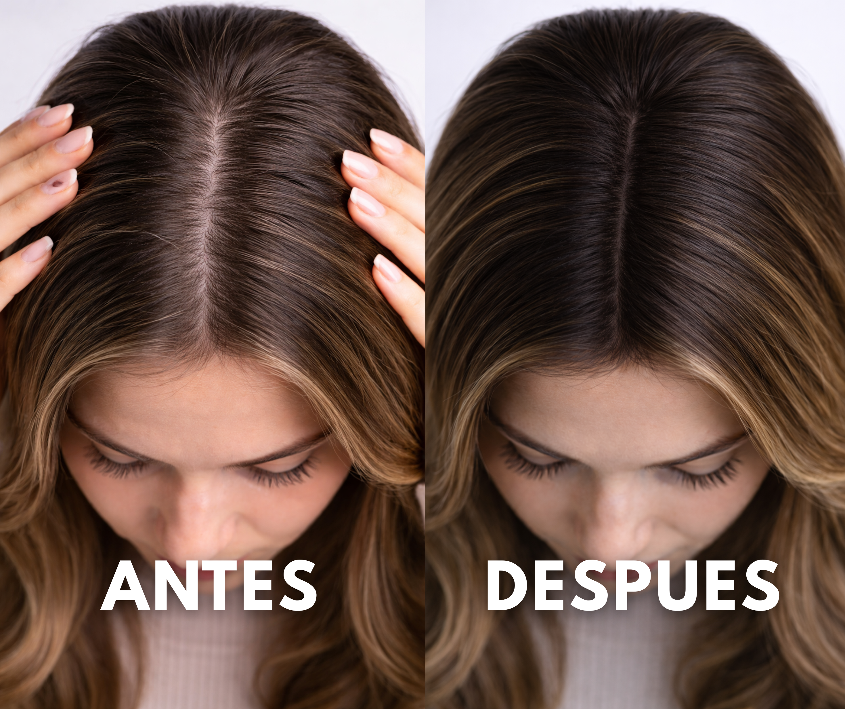 Microfibras naturales diseñadas para integrarse con el cabello existente y mejorar visualmente la densidad de forma inmediata.